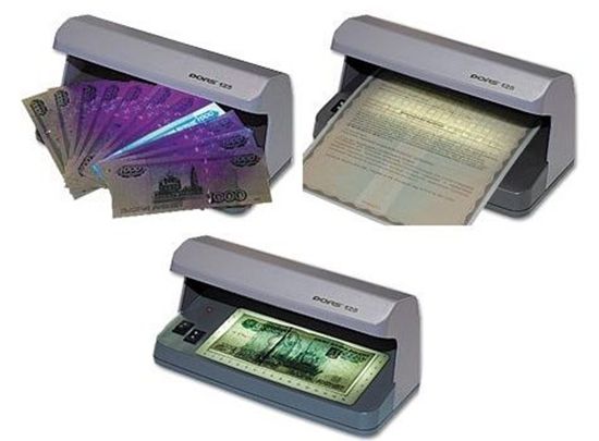 Ультрафиолетовый просмотровый детектор DORS 125 предназначен для визуального контроля подлинности банкнот различных валют, ценных бумаг, документов строгого учета на защищенных бланках, документов удостоверяющих личность и другой защищенной полиграфической продукции несколькими методами. Благодаря мощному УФ-источнику (12 Вт) и широкой рабочей зоне, DORS 125 позволяет комфортно и эффективно работать при ярком дневном свете или в хорошо освещенном помещении, осуществлять УФ-контроль банкнот "веером" и в корешке. DORS 125 также оснащен нижним источником белого проходящего света. Широкое просветное поле с измерительной линейкой позволяет эффективно контролировать на просвет и по размеру банкноты любых валют. Благодаря щели в задней стенке корпуса удобен контроль в УФ-свете и на просвет документов больших форматов.
