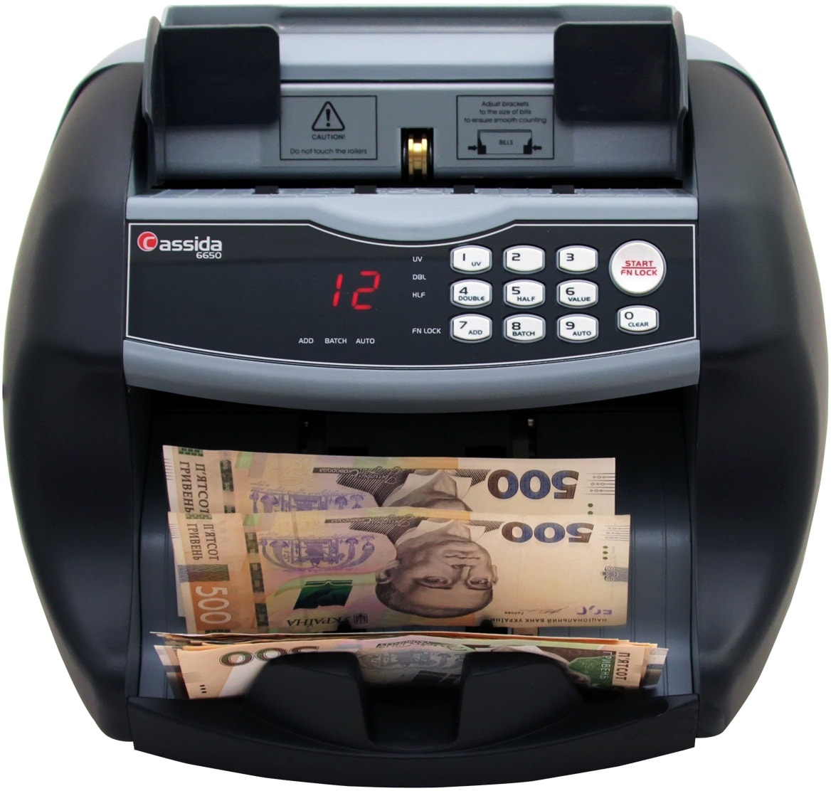 Cassida 6650 UV – мультивалютний лічильник банкнот з ультрафіолетовою детекцією та безліччю режимів перерахунку. Швидкість роботи досягає 1000 банкнот за хвилину. Місткість завантажувального та накопичувального бункера становить 400 та 500 банкнот відповідно. Лічильник банкнот Cassida 6650 UV - одна з найпопулярніших моделей, що поєднує в собі надійність, багатофункціональність та доступну вартість. Апарат відмінно підходить для роботи із середніми обсягами готівки та може використовуватись у банківській сфері, а також у малому та середньому рітейлі.